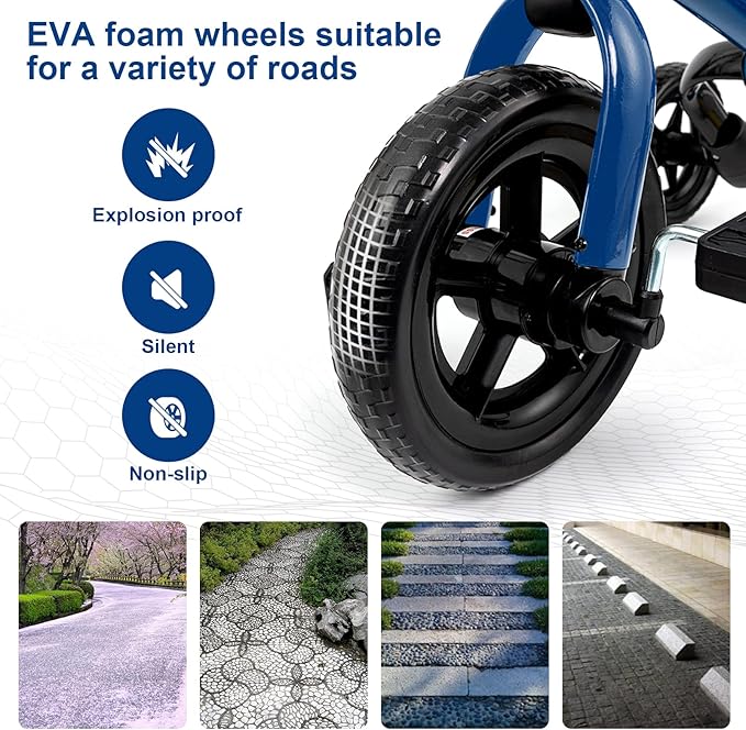 - 🎊Sturdy and Durable: Made of durable carbon steel, this tricycle ensures stability and high quality. The puncture-resistant EVA wheels do not require inflation and won’t scratch or damage floors. The tricycle can handle various outdoor terrains. It also features non-slip rubber handle grips for added comfort.