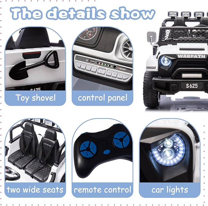 - 【Realistic and Attractive Function】The kids 2 seater ride on car truck equip with MP3 player, AUX input, USB port & TF card slot, and it also can be connected to your device to play music or stories, provide your children with real experience and enjoy their favourite music anytime. The forward and reverse functions on remote controller for adjustment, children will gain more autonomy and entertainment during playing.