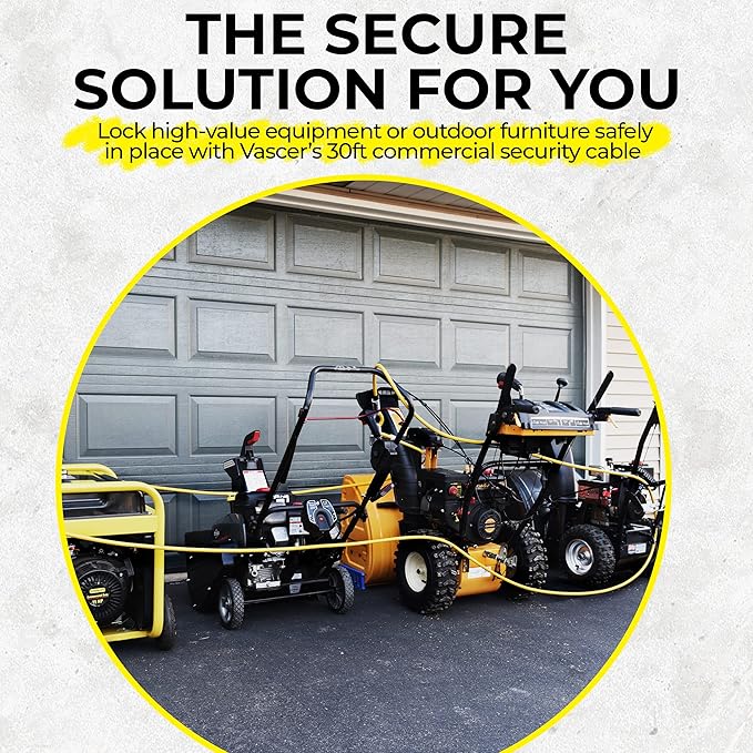 - Protect Your Possessions — Safely secure your expensive, heavy-duty equipment with the Vascer 30-foot long locking cable. Our galvanized steel cable with loops can be combined with virtually all heavy-duty or commercial grade padlocks to prevent theft