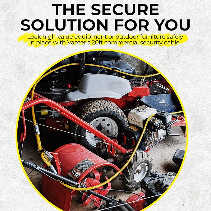 - Protect Your Possessions — Safely secure your expensive, heavy-duty equipment with the Vascer 20-foot long locking cable. Our galvanized steel cable with loops can be combined with virtually all heavy-duty or commercial grade padlocks to prevent theft