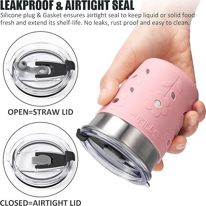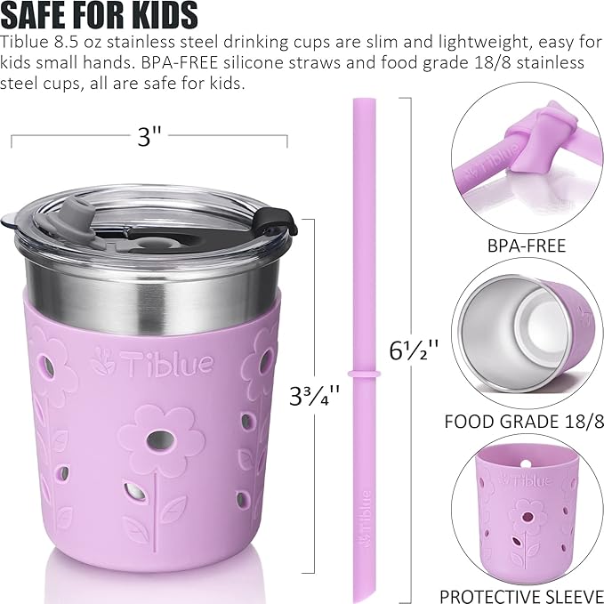 - PREMIUM MATERIALS FOR KIDS: Tiblue kids cups are made of food grade, toxic-free, premium 18/8 stainless steel, the sleeves and straws adopt lead free silicone, and spill proof lids are made of durable BPA-FREE plastic. This shatterproof stainless steel cups set comes with 4 Kids Stainless Steel Cups with Silicone Sleeves, 4 Leak-proof Lids, 4 Silicone Straws with Stopper, 1 Straw Cleaning Brush, perfect for helping your little ones drink freely at home or outdoors without spills or messes