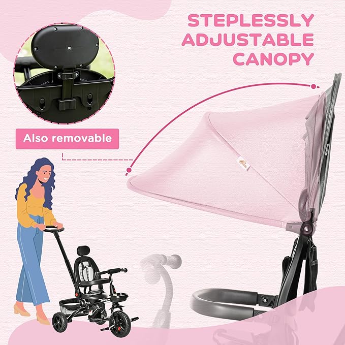 - Fully Adjustable: The parent handle of the stroll trike is 3-gear adjustable, to suit parents in different heights. The flexible and removable canopy provides a shaded area. Also, the foldable footrest and backrest in adjustable angle providing your kid comfortable seating. The trike is foldable to carry on in car