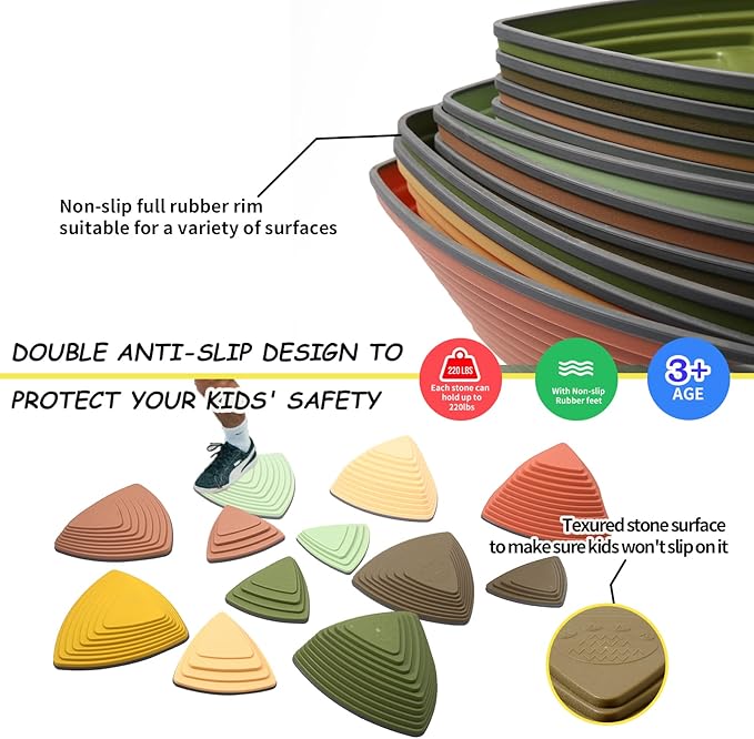 - 「High-Grade & Enough Material, Durable & Strong Bearing」: Using non-toxic and odorless healthy PP material, it is even more durable than natural river stones, so please feel relief to place them outside. The max load is 220lbs, also suitable for adults, so this balance training kit is also an excellent parent-child game toy.
