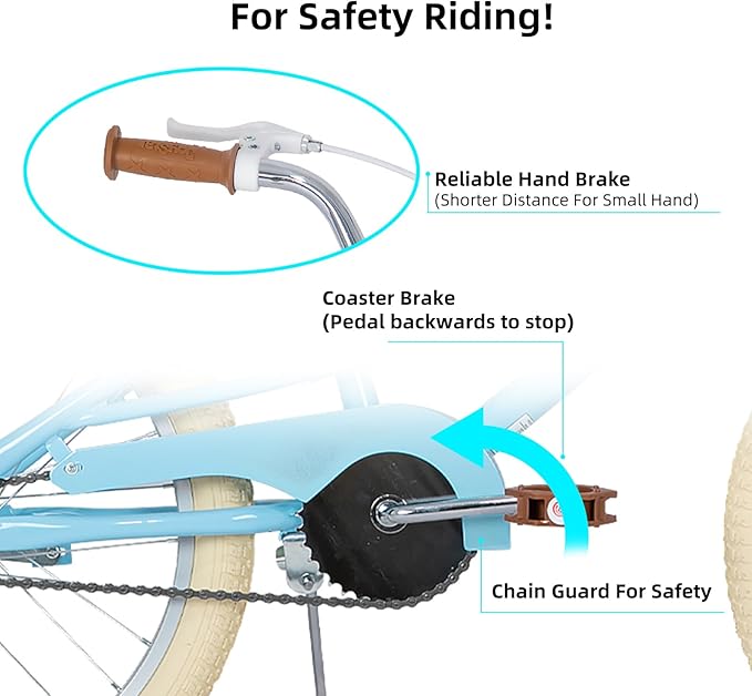 - 3, Safer Riding! The Front hand caliper Brake plus rear coaster/foot brake offer ample stopping power with more safety, wide 2.125" pneumatic tires add more stability, Sturdy steel frame and crank, Non-slip resin pedal, enclosed chainguard, front & rear reflectors and wheel reflectors make this bike safe to ride.