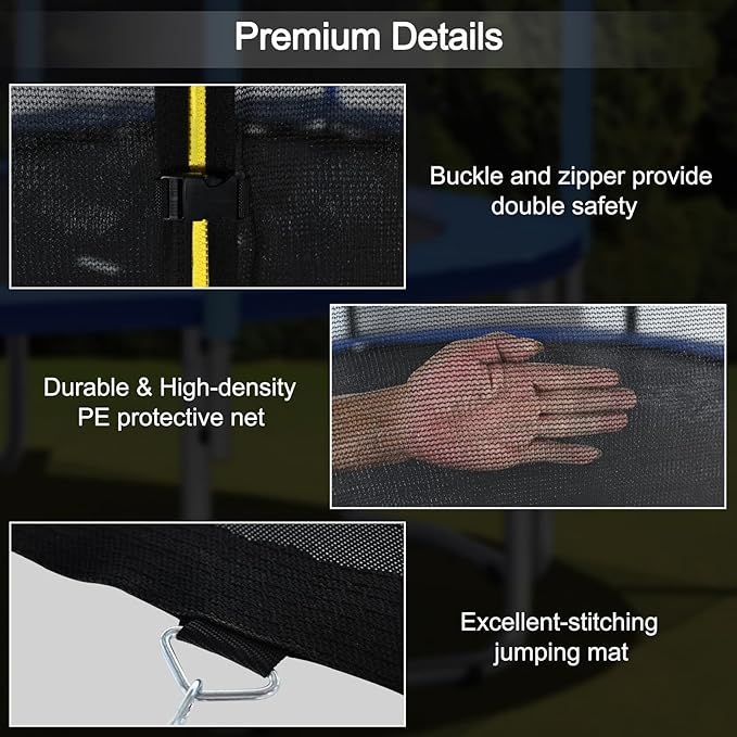 - [ Removable Ladder Design ]: Our trampoline features a stable ladder that is convenient for kids to climb up and down. More than that, there exist upright foam-padded poles, a dual zipper, and buckle-up closure system on the woven net for extra safety.