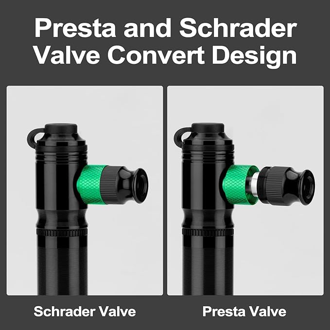 - Presta and Schrader Valve Convert Design: The bike air pump has ingenious design works with Presta and Schrader valves. No matter you own mountain or road bikes, it’s a portable bike pump for all, and you don't have to carry a presta converter any longer