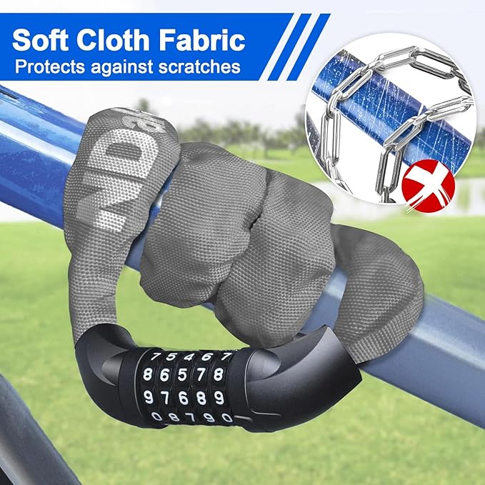 - SCRATCH-PROOF FABRIC PROTECTION: The bicycle chain lock is wrapped by a high quality polypropylene fabric, which is scratch-proof and wear-resistant, anti-hot and anti-icing hands; it protects the chain and prevents it scratching your bicycle frame, long lifespan.