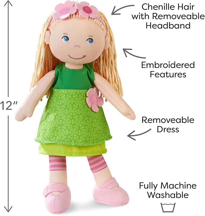 - REMOVABLE OUTFIT: Mali, the plush baby doll comes with a green dress, leggings, shoes, and flower hairband that can be easily removed and mixed with other HABA baby doll accessories.