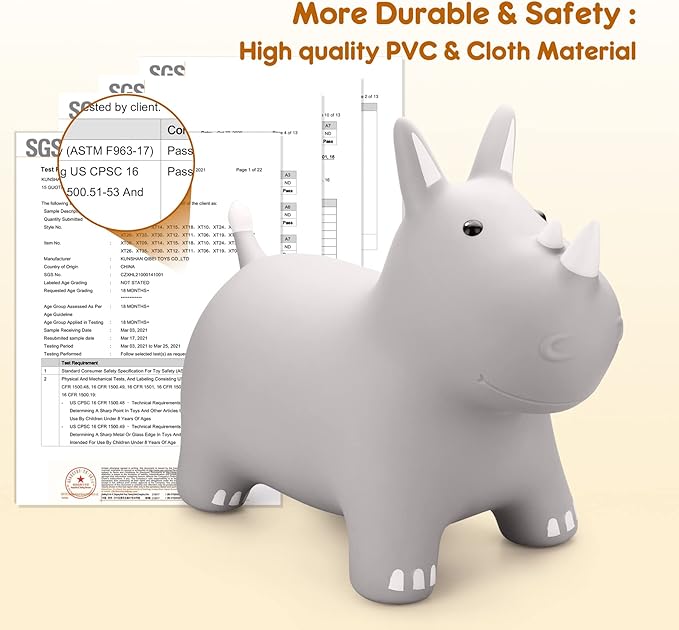 - 【High-quality Material】Our Bouncy Horse Hoppers are crafted from premium PVC material, ensuring they remain inflated and bouncy while kids hop and bounce almost anywhere. This material not only enhances durability but also provides stability during play. Each of our Bouncy Horse Hoppers has successfully passed rigorous testing, meeting the standards of ASTM F963-16/17 and CPSIA.