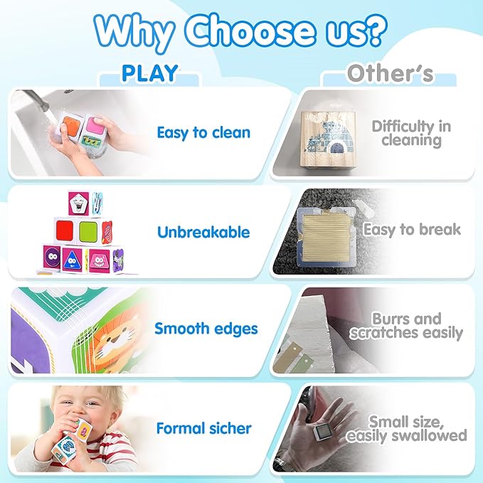 - Safe for Toddlers: Each block measures 1.85 inches, making them a safe size to prevent choking hazards. The rounded edges are carefully processed to be smooth and burr-free, providing a perfect fit for babies and ensuring safe playtime. This thoughtful design not only guarantees safety but also offers a comfortable grip, allowing toddlers to play more fun.