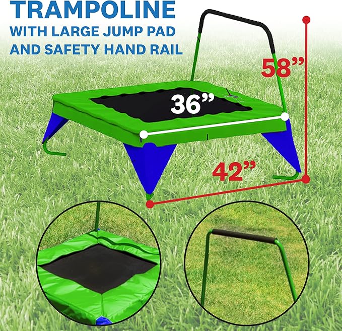- EIGHT FUN STATIONS: This set comes with a 36" fitness jumper trampoline, a 32" flying saucer, a glider, a slide, monkey bars, a swing, a basketball hoop with a backboard, and a soccer goal with a net.