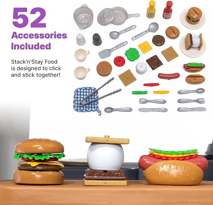 - INTERACTIVE TOYS: Realistic sounds, 52-piece toy kitchen play set, enhance playtime with cooking pot, tongs, oven mitt, trays, plates, utensils, s'mores, food (batteries not included)