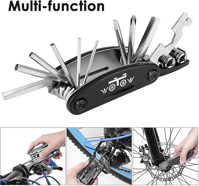 - Essential Bike Repair Set --- WOTOW Bike Portable Repair Kit includes a waterproof bike top tube frame bag, a 120psi mini bicycle pump, a 16 in 1 multi-function bike repair wrench tool, some bike tire bars and patches. All the accessories can be held in the bicycle pouch which mounted underneath the frame, which make your riding and travelling no troubles and easily. An ideal Thanksgiving and Christmas gift for bikers