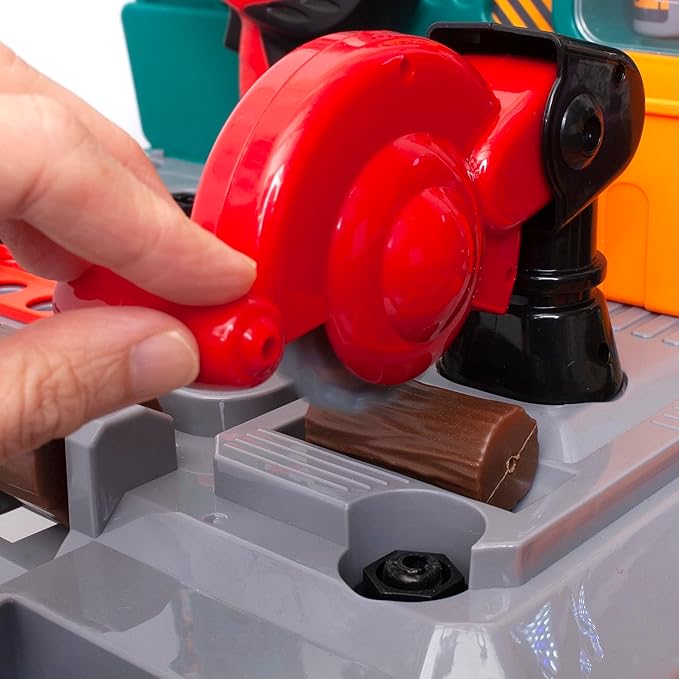 - INTERACTIVE CIRCULAR SAW & MORE: The playset features an engaging interactive circular saw, power drill, hammer, screwdriver, pliers, wrench, handsaw, and a clamp on the workbench to keep pieces secure. Children can immerse themselves in role-playing scenarios that mimic real-life experiences.