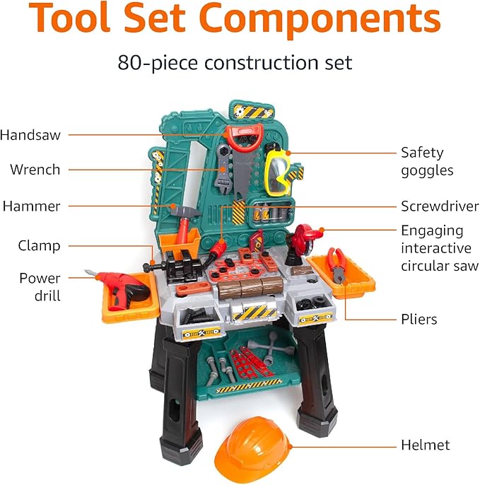 - INCLUDES PLAY SAFETY EQUIPMENT: For a complete workbench experience, the play set also includes a play helmet and safety goggles. These accessories not only add to the fun but also introduce kids to the importance of safety when working with tools.