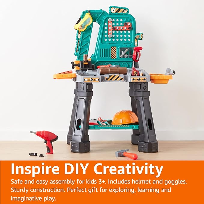Amazon Basics Kids Workbench Construction Toy Tool Set Playset with 80 Pieces Including Tools, Accessories, Play Helmet & Play Safety Goggles, for Kids Ages 3 and Up, Multicolor, Medium