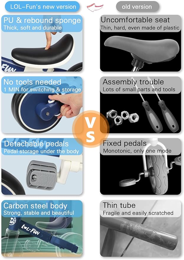 - 4 MODES: Newly mobile toddler wants to move in as many ways as possible. LOL-FUN 4 in 1 balance bike for 1-4 years old boys girls toy, which let kids scoot or roll around, are an ideal first birthday gift on the path to pedal bikes, helping them develop strength, balance, and nerve while they learn how to steer and adjust their speed