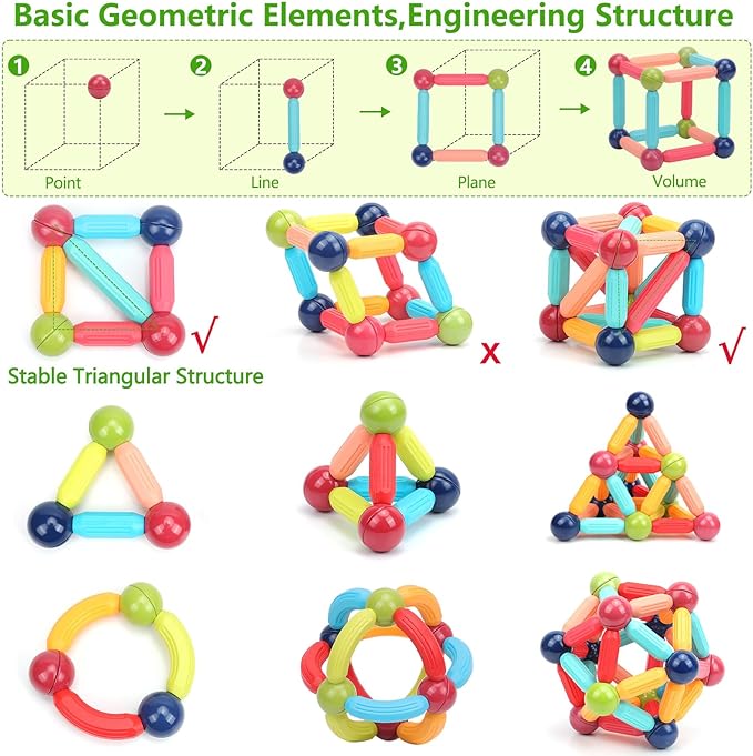 - 【STEM Unlock】: Unlock early STEM potential with this 74-piece magnetic construction kit that blends education and fun for 3-8 year olds. Kids can build 2D patterns and 3D shapes like simple bridges and houses. Through play, they develop problem-solving, shape recognition, and coordination. Bright colors and easy snapping pieces make learning hands-on and engaging.