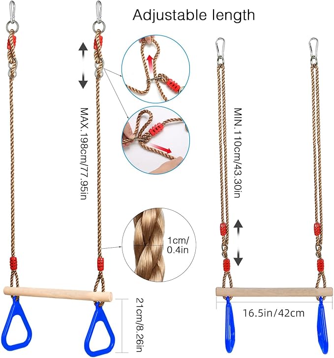 - 𝐔𝐏𝐆𝐑𝐀𝐃𝐄 𝐁𝐔𝐂𝐊𝐋𝐄 & 𝐑𝐎𝐏𝐄- The upgraded thoughful pressing buckle provide more stable combination of the rope and swing; The super wear-resisting and sturdy rope is up to 10 mm in diameter, more than 352LB/ 160KG load-bearing, adjustable in length. Length: Max:198cm/77.95inch Min:110cm/43.3in.