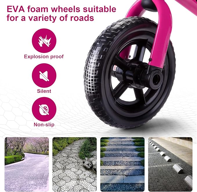 - 🎊Sturdy and Durable: Made of durable carbon steel, this tricycle ensures stability and high quality. The puncture-resistant EVA wheels do not require inflation and won’t scratch or damage floors. The tricycle can handle various outdoor terrains. It also features non-slip rubber handle grips for added comfort.