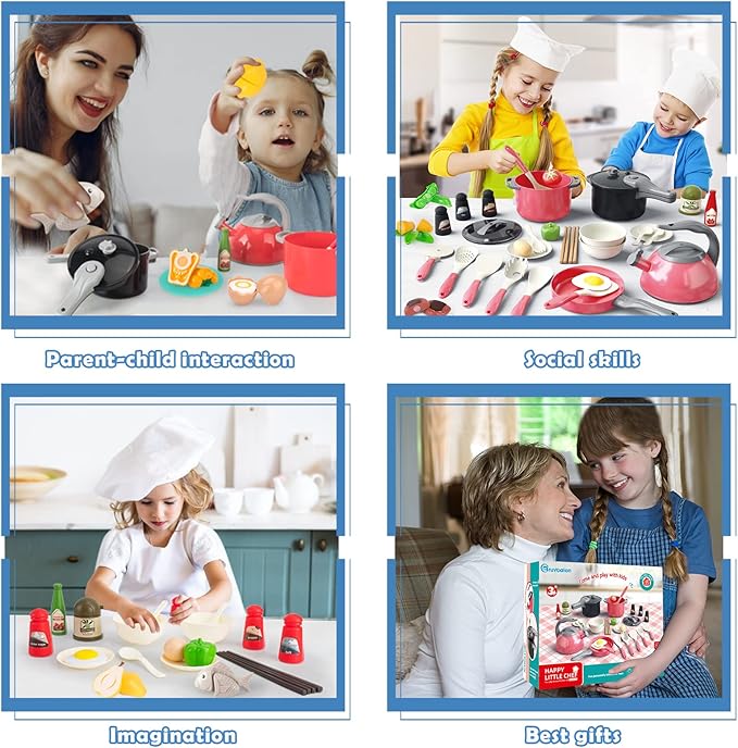 - Make Learning Endless Fun - Our pretend cooking playset encourages 3+ years old children to use their imagination and creativity while teaching them about different kitchenware, colors, fruits and foods and helping promote their color recognition, eye-hand coordination, intelligent learning and learn more about cooking. Perfect for cooking chef pretend play, baby role play
