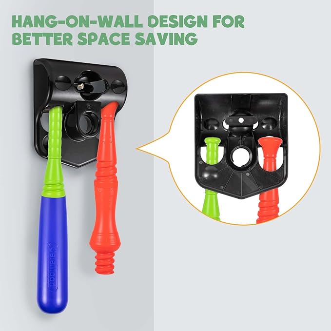 - Quickly Setup and storage: The bat and tee can be stuck to the base, which is designed for space saving and quick assemble. Your kids can hangs it on the wall and it doesn't take up too much living space in their room.