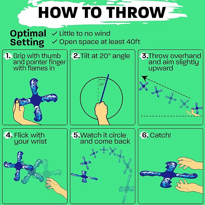- ๐๐ฎ๐๐ ๐ง๐ผ ๐๐ฒ๐ฎ๐ฟ๐ป: Embrace the simple joys of throwing a boomerang and having it come back to you with ease. With our beginner-friendly easy to throw design crafted from durable EVA foam. It's stable flight and comfortable grip make throwing and catching a breeze, ensuring a quick and enjoyable learning experience for kids age 6 and up.