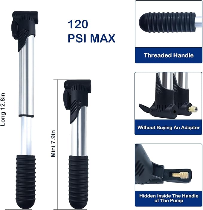- Portable Mini Pump bike tools: Mini bike pump (MAX 120 PSI) is made of high quality PVC and stainless steel, durable and lightweight, and supports both Presta & Schrader valves. Built in boost pressure system, It allows to quickly inflate at flat tires with less force. The sports needle make it can inflate various pinhole pneumatic tires, even sports Inflatable balls and rings