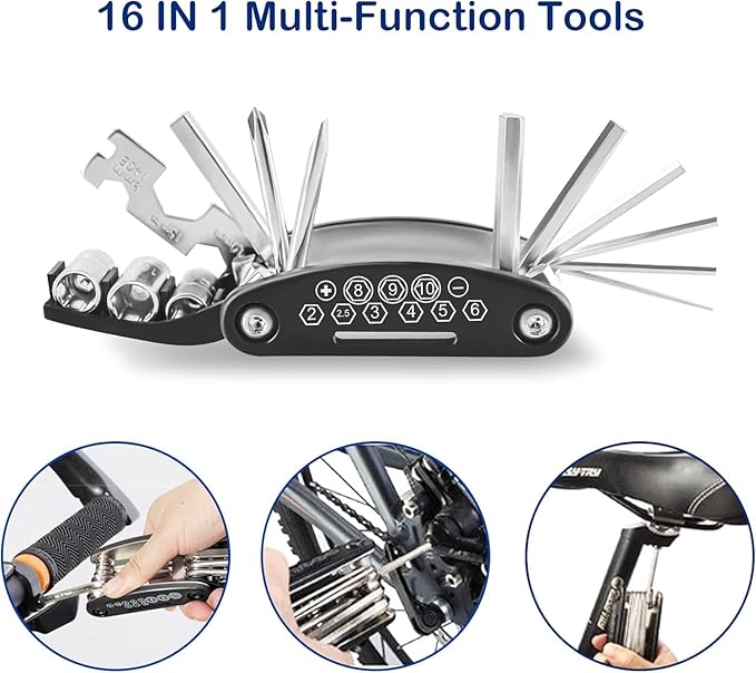 - 16 in 1 Multi function Bicycle Repair Tool: Foldable multi function bicycle tool is made of high quality stainless steel, sturdy and durable. Bike repair kits includes Socket Wrench (mm): 8/9/10 and a extension rod, hex key(mm): 2/2.5/3/4/5/6, Flat Wrench (mm): 8/10/15, slot driver, spoke 14GE, and phillips cross drive. bike accessories for adult bikes