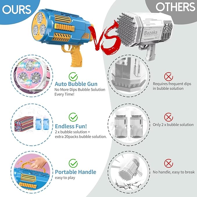 - HIGH OUTPUT THOUSANDS COLORFUL BUBBLES- BOMOCO Upgraded Auto Bubble Machine Gun can generate more than thousands bubbles per minute with four colorful lights to bring you amazing effects, whatever day or night, you can see rich colorful bubbles are blown out when pressing the trigger, the fantastic lights render colorful bubbles, and you can enjoy a colorful scene at night. Nice indoor and outdoor bubble toys.