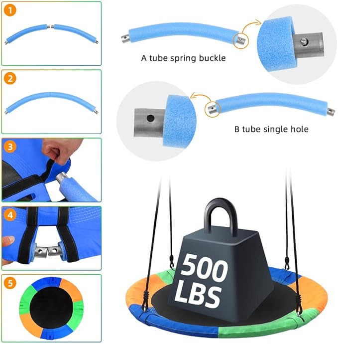 - Eight Padded Irons Tubes: The high-quality irons tubes are padded with soft foams which are comfortable and safe for children. The tubes can be connected and balanced easily by the provided eyebolts of the ropes, and there are no extra tools needed for installation as all the accessories are included in the package. Our saucer tree swing is a nice gift for your kids and friends.