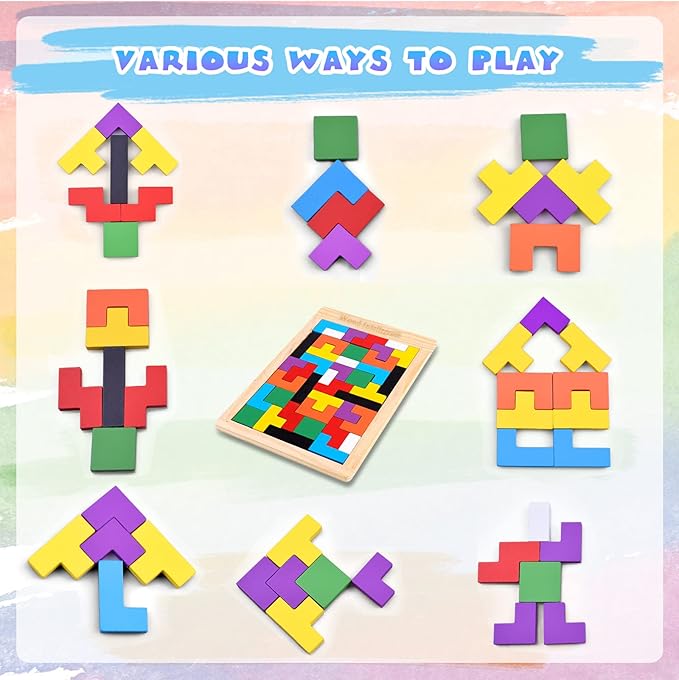 - Safe Toys: This wooden puzzle is made from natural safe basswood, which is smooth sanded and rounded to the touch. Non-toxic paint ensures kids can play safely. It contains 40 colorful wooden blocks, and a 10.82inch x7.28inch x0.39inch board.