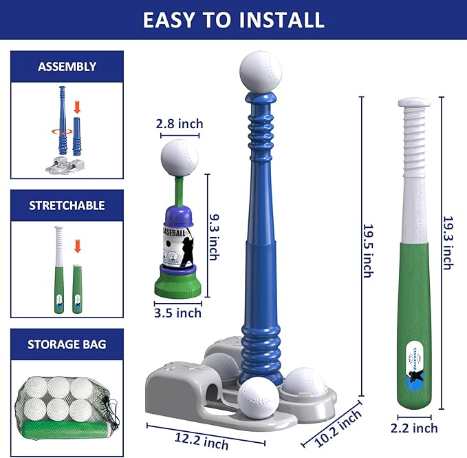- [UPGRADE T-BALL SET] - What you will get: 1*adjustable batting tee, 1*automatic batting machine, 1*stretchable bat, 6*balls, 1*storage bag, 1*base, Our baseball set is made up of high-quality durable materials and strictly certified by ASTM, BPA-free. The smooth & round edge and non-slip handle design can protect your baby’s small hands. Let your baby experience baseball with safe!