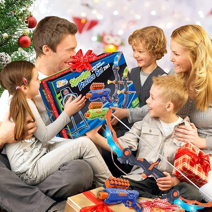 - 2 In 1 Shooting Games:Our upgraded shooting toy set is compatible with 2 shooting modes, bringing more fun for children's play.It includes 2 collapsible bow with LED lights, 20 suction cup arrows, 2 adjustable shoulder strap quiver, 2 foam darts shooting toy guns, 20 foam darts (10 blue and 10 green) and 1 standing shooting practice target. An adequate amount of archery equipment will provide players with a great value for the game experience.