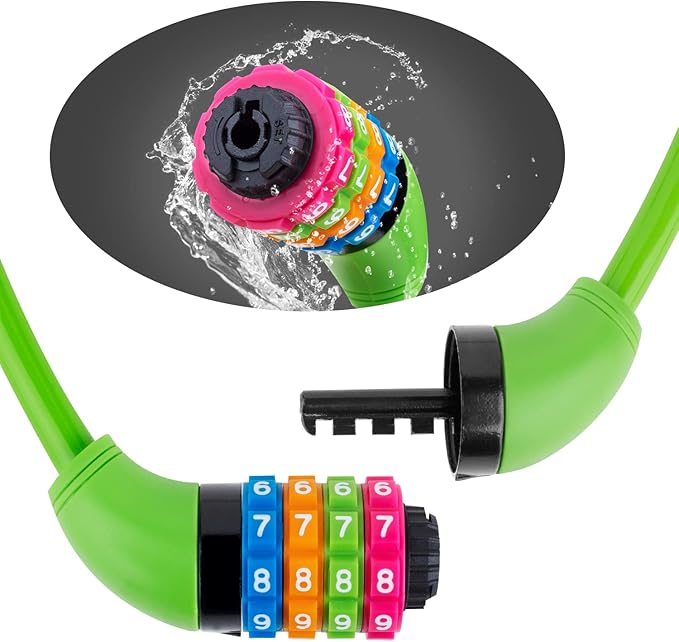 - Special Feature : Alloy lock head large slide window, Kids friendly, easy to rotate or change password, Multi-purpose, the cable of bike lock is 2 feet long, enough for you to lock your bike to a tree/gate/fence/railing/etc. This cable bike lock can also be used for motorcycles, skateboards, scooters, grills & lawnmowers, sports equipment, tool boxes & ladders and doors., Resettable 4 digit combination bike cable lock, With 6 different colors: Black, blue, pink, purple, green, orange, the bike cable lock is suitable for kids, girls, boys and women, also a great choice for Birthday/Anniversary /Christmas gifts. Alloy lock head large slide window, Kids friendly, easy to rotate or change password, Multi-purpose, the cable of bike lock is 2 feet long, enough for you to lock your bike to a tree/gate/fence/raili… See more