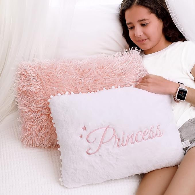 - BRIGHTEN UP ANY ROOM DECOR - Add a pop of color to your bedroom, girl’s playroom or big kid’s room with these girls decorative pillows. This set includes a white princess pillow and a pink furry pillow. Place on the nursery chair, bed or in a reading nook.