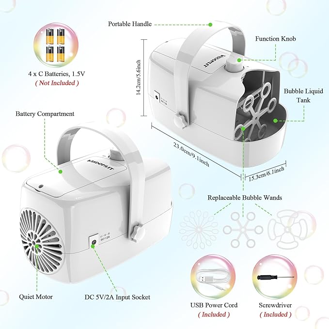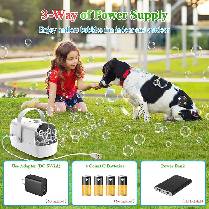 - 【3 Ways of Power Supply, USB Cable or Battery】Bubble Blower Can Be Powered by 4 Count 1.5V C Batteries (Not Included) or Plug In USB Power Cable with Adapter (Not Included), Phone Charger or Power Bank, More Convenient To Use And Enjoy The Bubbles Leisure Time Indoor and Outdoor