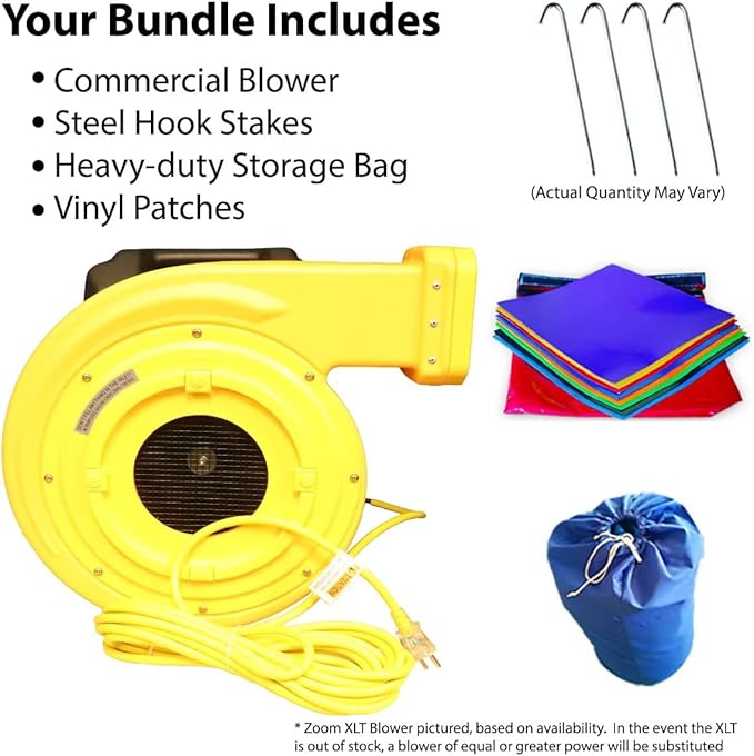 - INCLUDES: Mega Pirate Ship Water Slide and Bounce House Combo, 1.5hp Heavy Duty Commercial Blower, (6) Steel J-Hook Ground Stakes, Safety Sign, Business Card Holder, and Heavy Duty Storage Bag