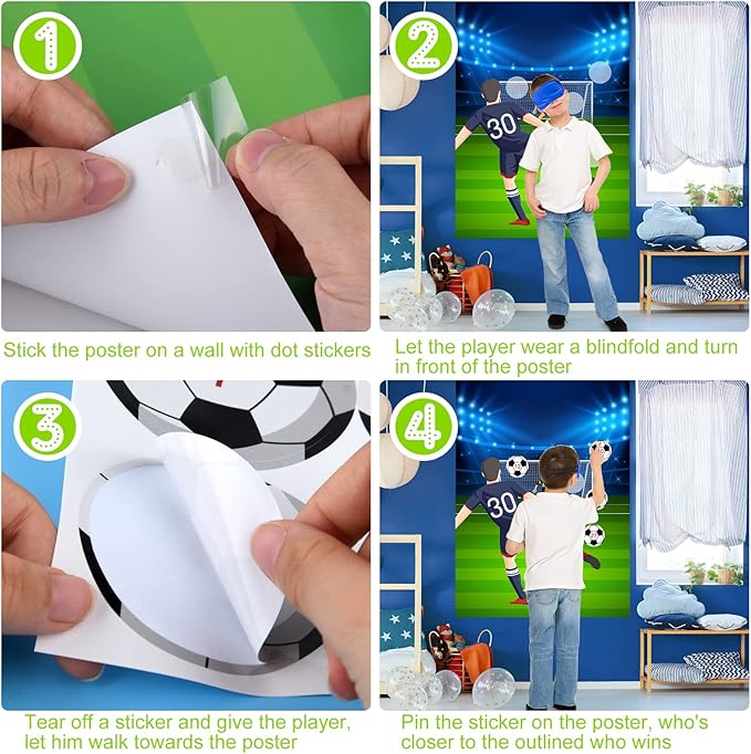 - Package Includes: 1pcs soccer game poster, 1pcs soccer party card, 30pcs soccer ball stickers, 2 blindfolds, 1sheet dot sticker. Classroom family activities, birthday party games, soccer party decorations