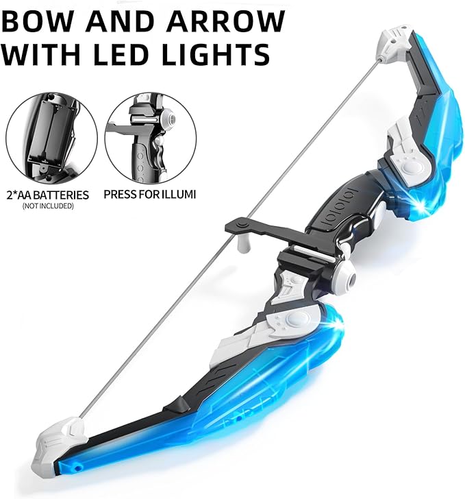 - More Attractive Outdoor Toy - The archery set with led light is one of the favorite outdoor toys for kids.The LED lights make it easy for kids to track arrows at night and enjoy a great shooting game.2*AA batteries needed(not included).