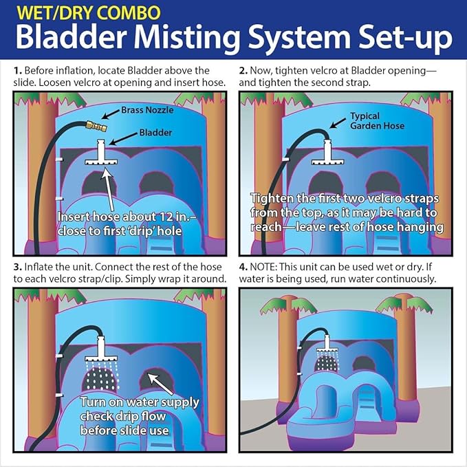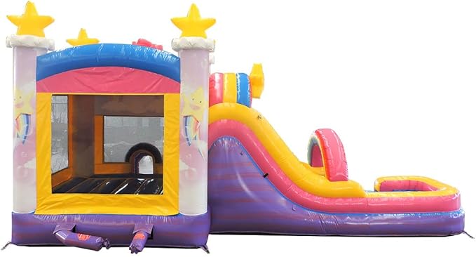 - INCLUDES: Mega Unicorn Water Slide and Bounce House Combo, 1.5hp Heavy Duty Commercial Blower, (6) Steel J-Hook Ground Stakes, Safety Sign, Business Card Holder, and Heavy Duty Storage Bag