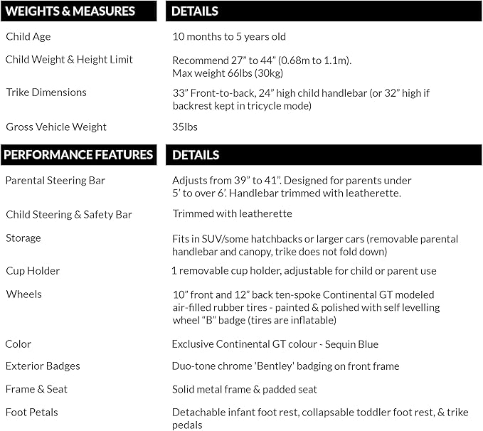 - OFFICIALLY LICENSED AND DESIGNED BY BENTLEY MOTORS UK - This 6-in-1 tricycle makes a bold statement everywhere you go. It transforms from a baby tricycle to a big kid trike as your baby grows from 6 months to 5+ years old. This Trike needs assembly and has a two-year manufacturer warranty. Instructions included.