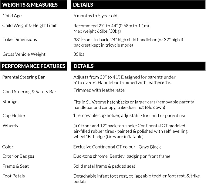 - OFFICIALLY LICENSED AND DESIGNED BY BENTLEY MOTORS UK - This 6-in-1 tricycle makes a bold statement everywhere you go. It transforms from a baby tricycle to a big kid trike as your baby grows from 6 months to 5+ years old. This Trike needs assembly and has a two-year manufacturer warranty. Instructions included.