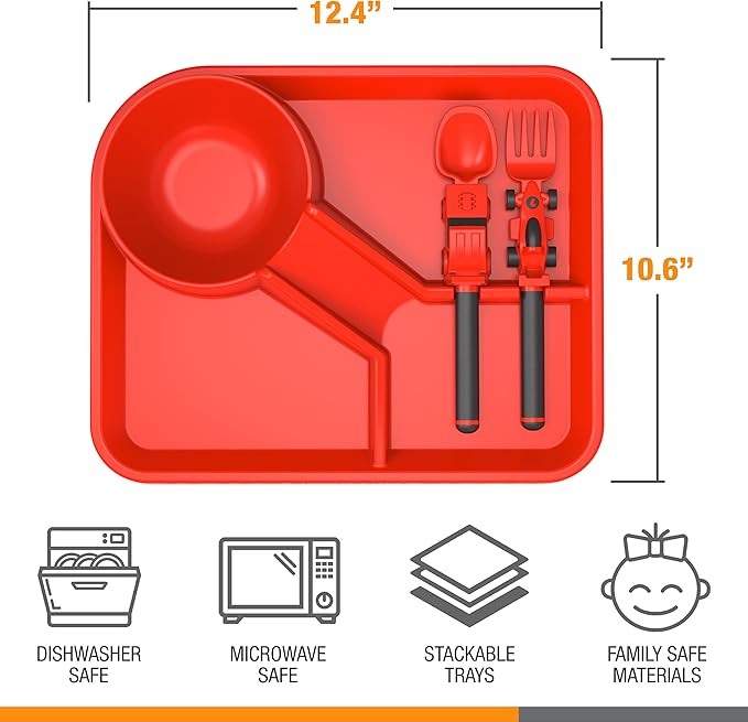 - RED RACE CAR THEME: A sneaky fun way to encourage healthy eating for kids! The plate consists of four divided zones: three plate areas and one bowl. There's a "Formula 1" fork and a "Stock Car" spoon and a ramp that leads up to the bowl!