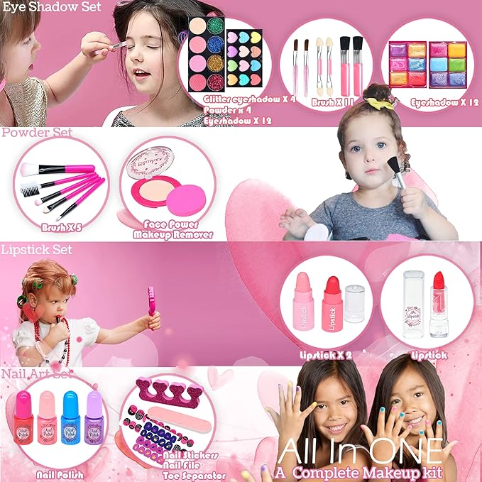 - 【Washable Makeup X 100% Child Safe】:Kids makeup kit for little girls set use water-soluble formula, no added preservatives, mild and non-irritating, no burden on the skin.Kids Makeup Kit Toys for Girls The smooth exterior design makes it not easy to be damaged and protect children's soft hands, Easy to Wash, Non-Toxic. Meet the standards of international children’s toys(CPSIA, CPC, ASTM certificates)birthday gifts, a Christmas gift, Easter toys,toys for 5+ year old girls