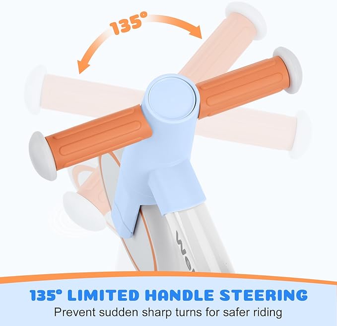 - 💗Safe Design for Toddler - The baby balance bike height from ground to handle(1.1ft) ,ground to seat(0.8ft) ensures your child’s feet are always touching the ground so they stay in control of their speed, stopping & movement. With 135°steering limit to prevent your baby from rolling over. Baby's First Bike.