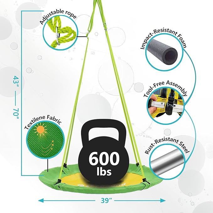 - [ Supports up to 600 LBS ] Families love how our outdoor swing brings everyone together. With its 39-inch diameter and 600-pound weight capacity, this tree swing for kids can easily support more than one child or adult, making it great for group play and family bonding.