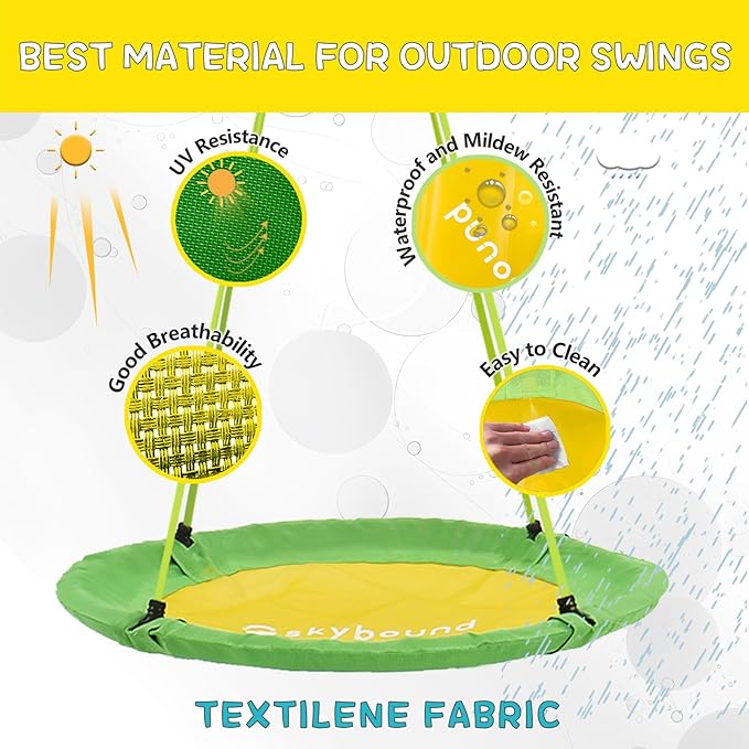 - [ Superior Quality ] SkyBound 39-Inch Saucer Tree Swing is perfect for backyard fun and family time. Made with a heavy-duty galvanized steel frame, premium polypropylene seat, and Textilene fabric outer, this durable and easy-to-clean outdoor swing is ideal for both kids and adults. With a 600lb capacity, it includes reinforced straps, locking carabiners, and soft foam padding. ASTM F1148-21 certified for safety, making it one of the best swing sets for backyards.