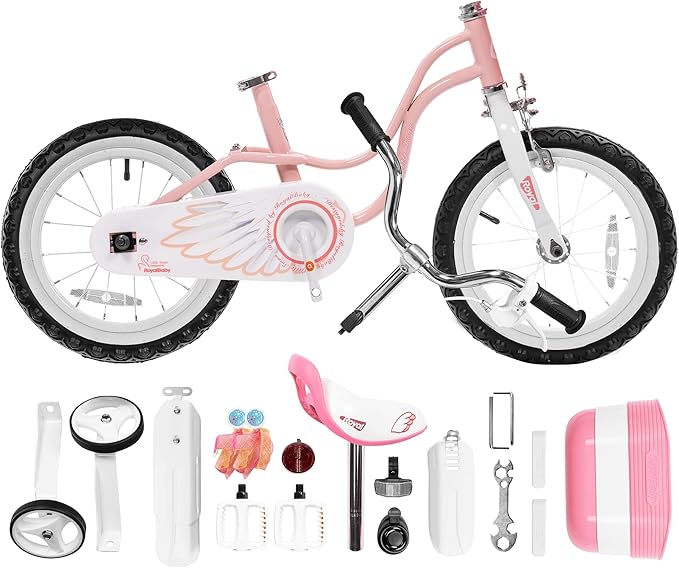 - 🎁SPECIFICALLY FOR GIRLS-Royalbaby girls bike has a low stance and delicate curve frame, which is easy for kids to hop on. Cute bike in lovely colors and details, dual brakes (pedal and hand), detachable height-adjustable wider training wheels for excellent steadiness, a bell, and a basket for her dolls. It's a great first bike with all the bells and whistles a child will need to learn and get comfortable with biking.