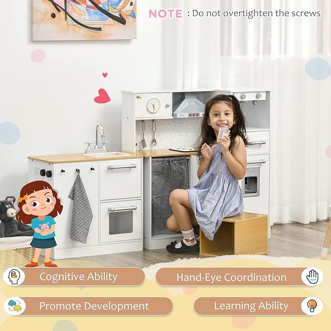 Qaba Kids Wooden Kitchen Playset with Sound Effects and Tons of Countertop Space, Wooden Corner Play Kitchen Set with Washing Machine, Imaginative Toy Pretend Restaurant, Ages 3-6, White